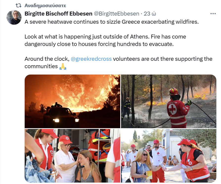 Ο Γενικός Γραμματέας της Διεθνούς Ομοσπονδίας Συλλόγων Ερυθρού Σταυρού & Ερυθράς Ημισελήνου στην Γενεύη, Jagan Chapagain, συγχαίρει ξανά, με δημόσια ανάρτησή του, το έργο του Ε.Ε.Σ. και των ακούραστων εθελοντών του για την αντιμετώπιση των καταστροφικών πυρκαγιών και του πρόσφατου καύσωνα.
