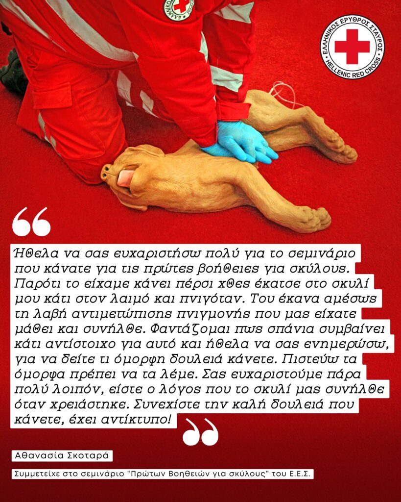 Συγκεκριμένα, η κα Αθανασία Σκοταρά, κατάφερε, ακολουθώντας τις οδηγίες που είχε διδαχθεί από τους έμπειρους εκπαιδευτές Πρώτων Βοηθειών του Ελληνικού Ερυθρού Σταυρού, να σώσει το σκυλάκι της από πνιγμό, όπως αναφέρει στο ευχαριστήριο μήνυμα που απέστειλε στον Ε.Ε.Σ.: «Ήθελα να σας ευχαριστήσω πολύ για το σεμινάριο που κάνατε για τις πρώτες βοήθειες για σκύλους. Παρότι το είχαμε κάνει πέρσι χθες έκατσε στο σκυλί μου κάτι στον λαιμό και πνιγόταν, του έκανα αμέσως τη λαβή αντιμετώπισης πνιγμονής που μας είχατε μάθει και συνήλθε. Φαντάζομαι πως σπάνια συμβαίνει κάτι αντίστοιχο για αυτό και ήθελα να σας ενημερώσω, για να δείτε τι όμορφη δουλειά κάνετε. Πιστεύω τα όμορφα πρέπει να τα λέμε. Σας ευχαριστούμε πάρα πολύ λοιπόν, είστε ο λόγος που το σκυλί μας συνήλθε όταν χρειάστηκε, συνεχίστε στην όμορφη σας δουλειά. Πρόσφατα αποκτήσαμε ένα μωράκι και με την πρώτη ευκαιρία θα δούμε κι αυτό το σεμινάριο! Συνεχίστε την καλή δουλειά που κάνετε, έχει αντίκτυπο!»